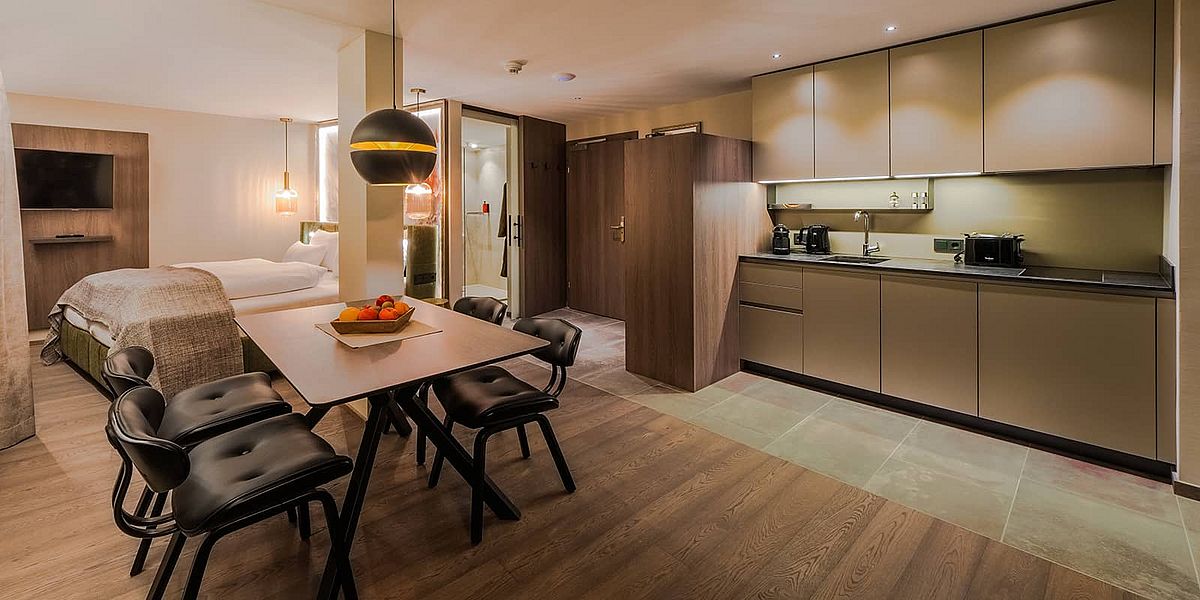 Green, blue, white or red? Grounded, lively, imaginative or full of bubbling energy? As soon as you enter our studios at VIER, you can literally feel the energy of the elements: earth, fire, water and air create a balanced synergy with great attention to detail. The comfort of modern apartments combined with the luxury of a one-room suite. With exceptional mountain views and boundless freedom: self-catering, conveniently order breakfast to your studio or dine in the hotel's own restaurant in the evening.